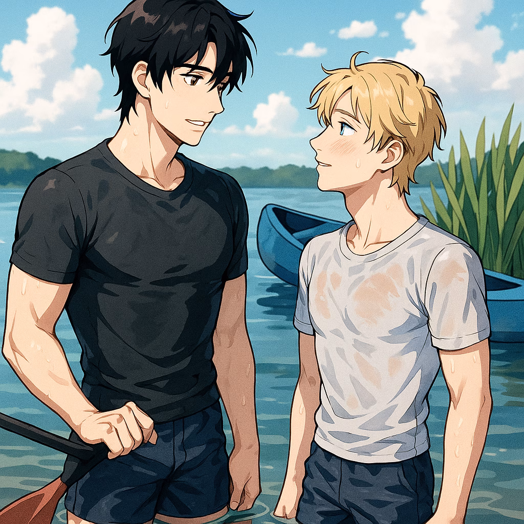 Sie paddelten zurück ans Ufer, tropfend, keuchend, frierend. Ihre Shirts klebten an der Haut, zeichneten Muskeln, Linien, Wärme. Tom sah Philipp an – sein Haar klatschnass, die Wimpern wie gefächert, das Lächeln immer noch da.