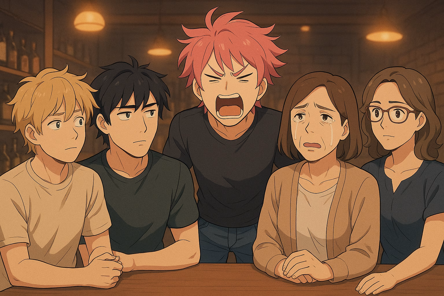 Jan steht klitschnass auf, sein Haar tropft, sein Stolz liegt am Boden. Wortlos wankt er in Richtung Ausgang. Die gesamte Bar johlt.