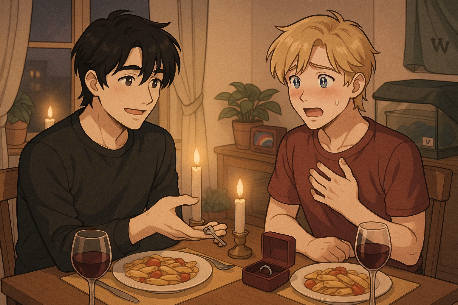 Als Tom ihm die Tür öffnet, merkt Philipp sofort, dass irgendetwas nicht stimmt – oder besser gesagt: dass etwas besonders ist. Die Wohnung ist aufgeräumter als sonst. Auf dem Tisch steht sein Lieblingsessen – Penne mit Ofentomaten und veganem Mozzarella. Zwei Weingläser. Sanftes Licht. Musik im Hintergrund. Philipp zieht fragend eine Augenbraue hoch.