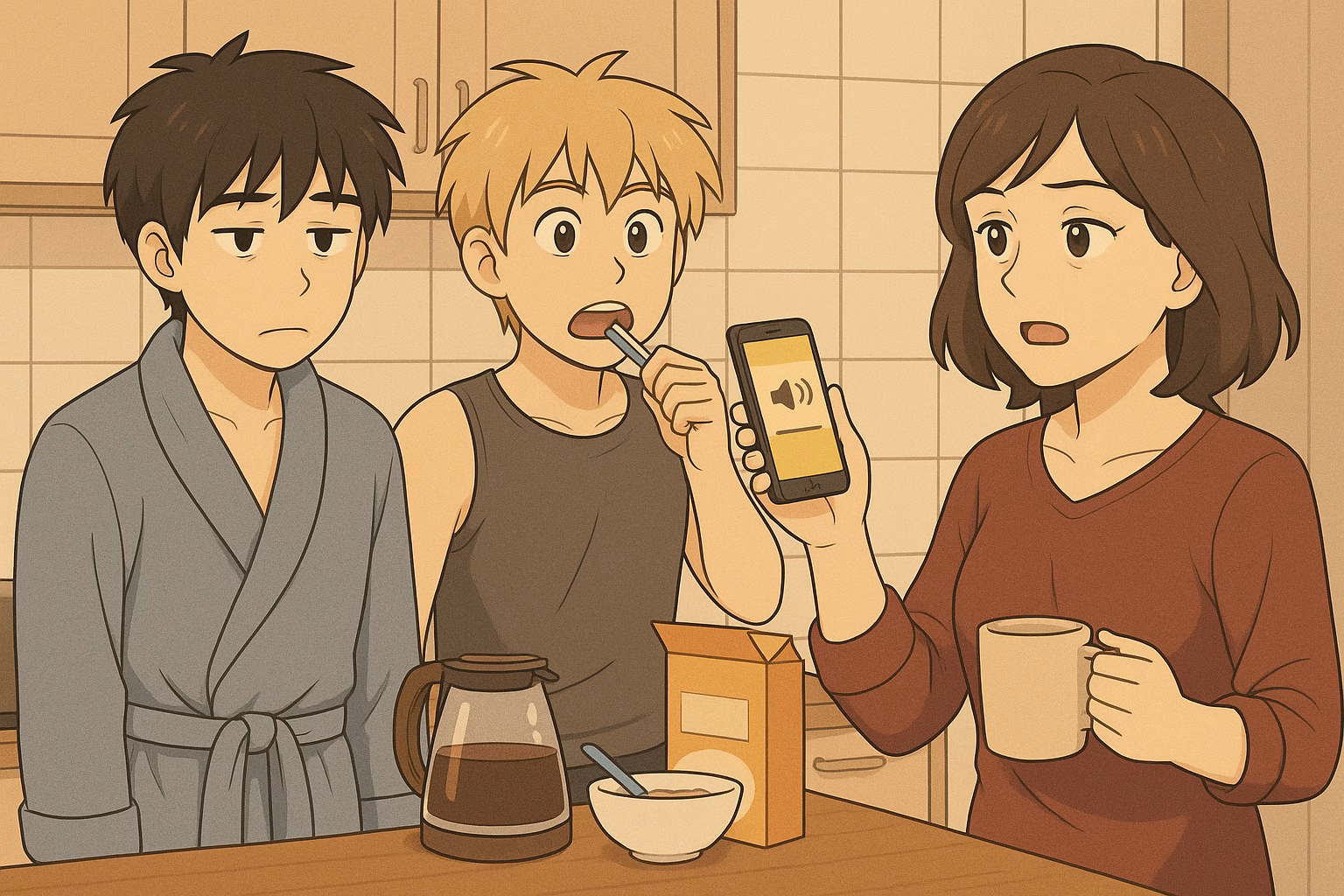 Tom kam im Bademantel aus dem Schlafzimmer, gähnte und schlurfte in die Küche. Philipp folgte ihm, barfuß, Zahnbürste im Mund, und stieß fast mit Frau Bond zusammen, die mit entschlossener Miene eine Haferflockenpackung in der Hand hielt.