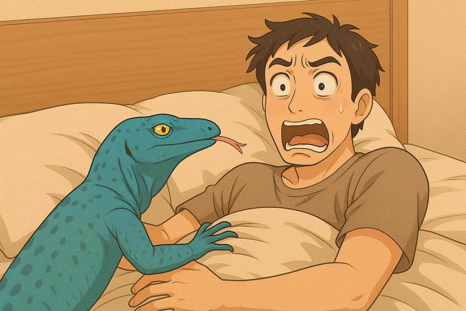 Ein dumpfer Polterer, Bettdecke fliegt, jemand tritt sich im eigenen Schock ins Schienbein. Tom taumelte aus dem Bett, stand in Shorts und Panik vor dem Terrarium – nur dass der Bewohner gerade AUF seinem Kissen lag und entspannt Richtung Fenster züngelte.