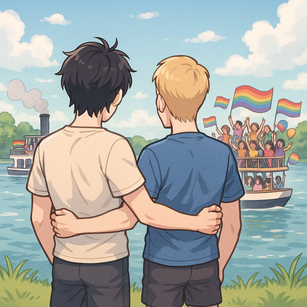 In der Ferne tuckert ein Ausflugsdampfer vorbei. Musik. Menschen auf dem Deck tanzen. Regenbogenflaggen flattern im Wind.