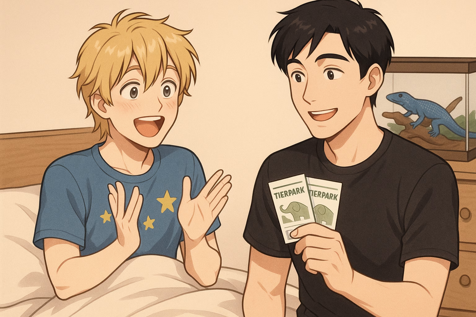 Tom tauchte im Türrahmen auf, grinste frech und hielt zwei Tickets hoch. „Tierpark. Heute. Du und ich. Frühstück gibt’s unterwegs.“