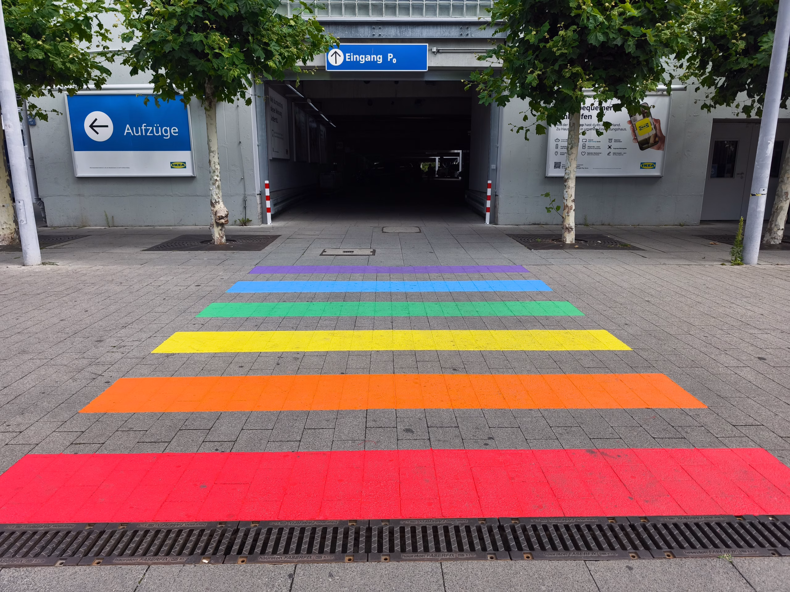 Inmitten von Billy-Regalen, Hot Dogs und Selbstbaumรถbel-Romantik รผberrascht IKEA nun auch mit einem deutlichen Bekenntnis zur Vielfalt: Zwei leuchtende Regenbogenstreifen fรผhren in knalligen Farben direkt auf den Haupteingang zu โ vorbei an Einkaufswagen und Parkdeck, mitten durch den grauen Betonalltag.