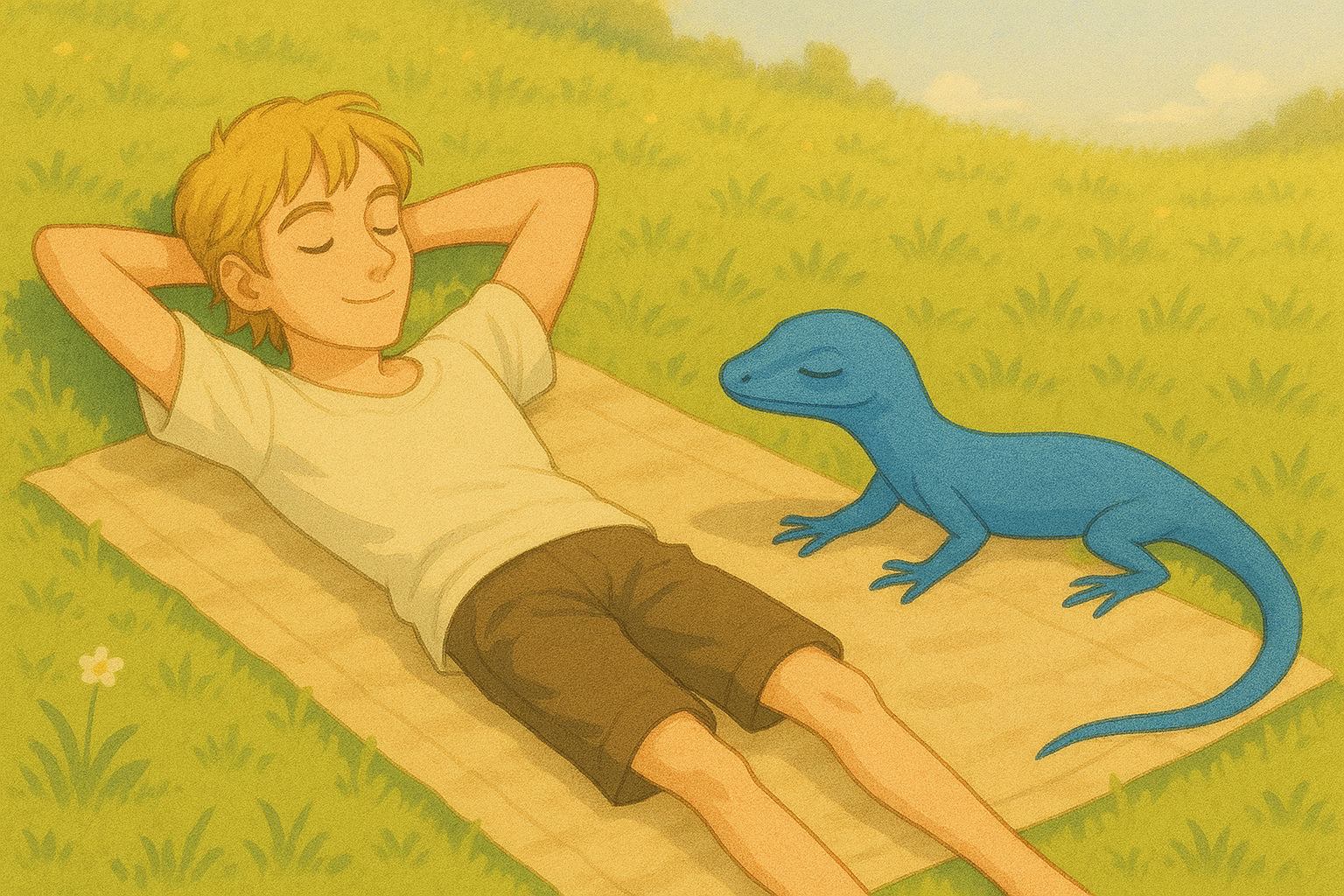 Philipp breitete seine große Decke auf der Wiese aus, ließ sich darauf plumpsen und atmete tief durch. Willi, inzwischen vollständig an menschliche Nähe gewöhnt und eher ein pelzloser Mitbewohner als ein Reptil, krabbelte behände aus dem mitgebrachten Tragerucksack, streckte seine Beine, reckte den Kopf in die Sonne und tappte über die Wiese – auf der Jagd nach Heuschrecken.