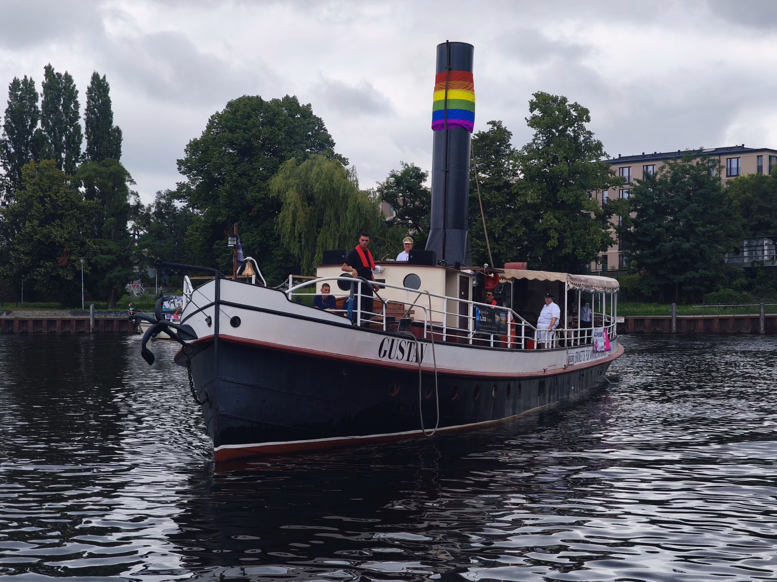 Die Gustav hebt sich klar von allen anderen Schiffen ab – ein echtes technisches und kulturelles Unikat. Und mit der Regenbogenfahne am Schornstein wird aus dieser Tour ein ganz besonderes CSD-Erlebnis. 🏳️🌈