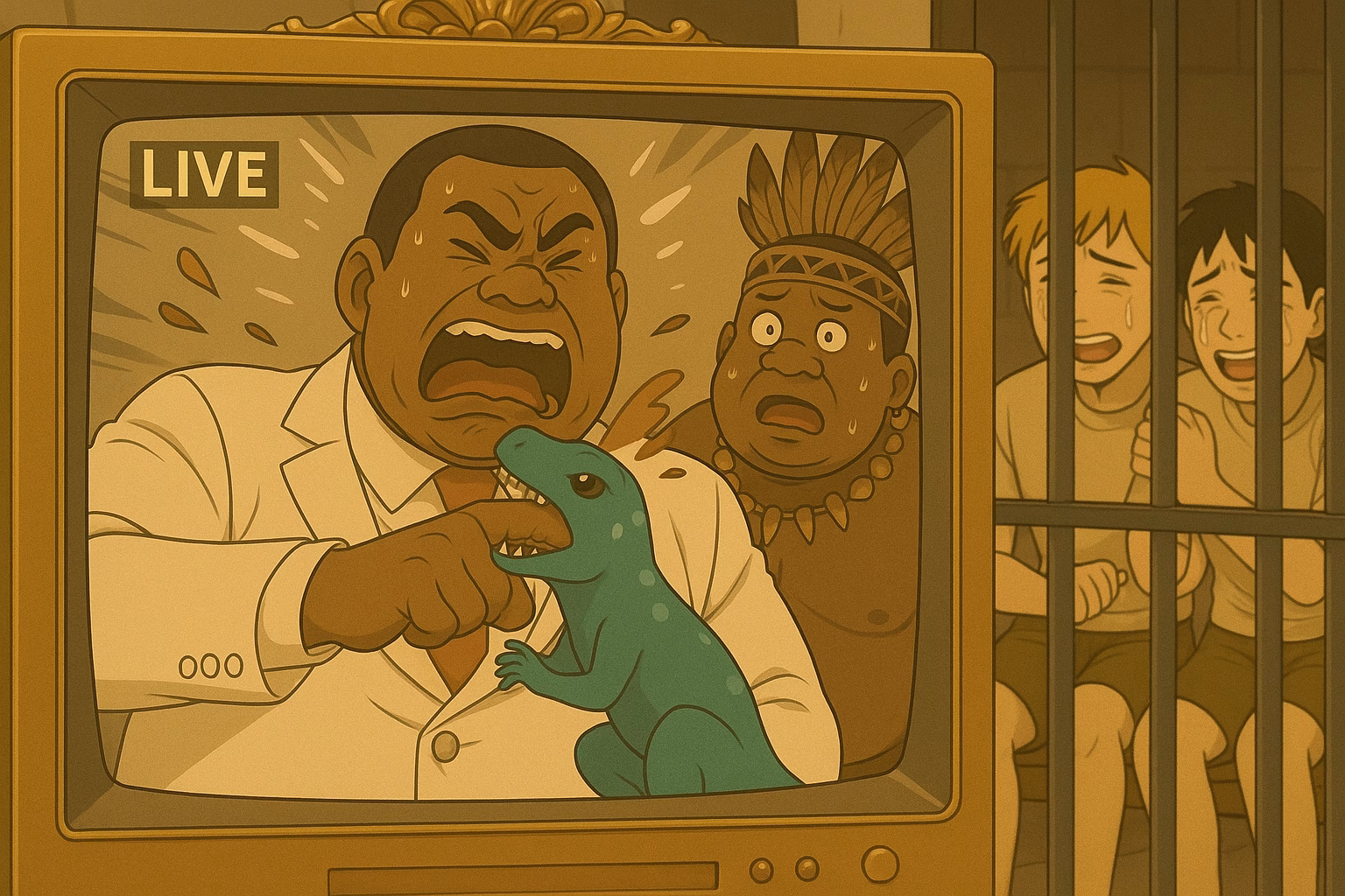 Auf dem Bildschirm erschien der Präsident von Zambora, neben ihm der dicke Medizinmann. Zwischen ihnen, auf einem goldenen Kissen, saß Willi – der blaue Baumwaran.