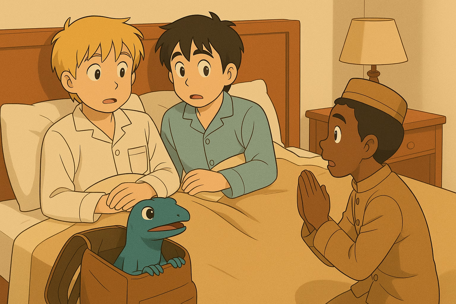 Philipp springt auf, zieht hektisch die Bettdecke hoch. „Moment! Das ist ein Haustier, kein Gott! Und… äh… wir sind auch gar kein Paar. Also nicht, was Sie denken.“