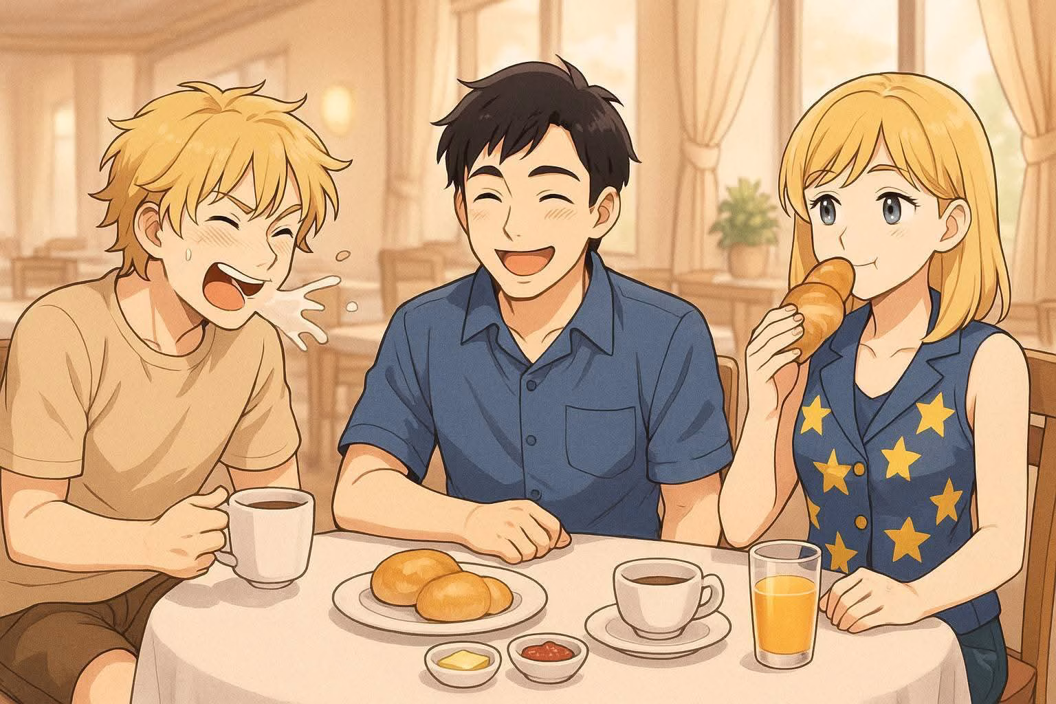 Der Frühstücksraum des Hotels war voll. Philipp und Tom saßen müde am Tisch, Frau Bond checkte schon ihre Notizen.