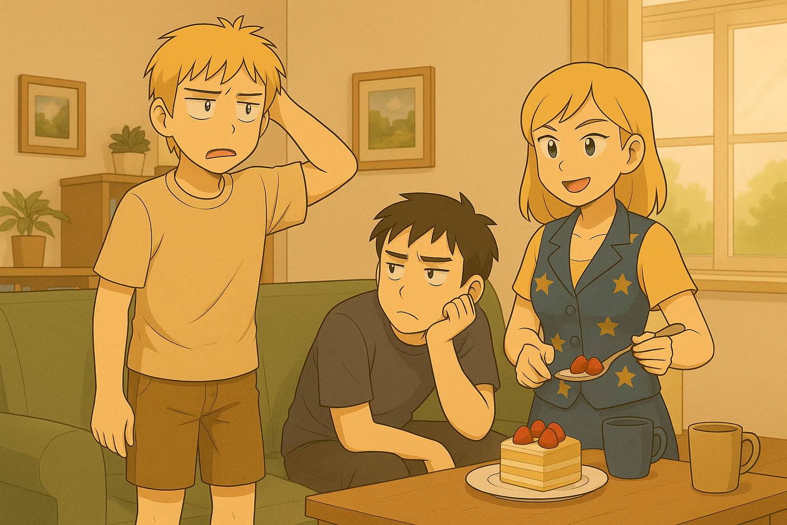 Sie schob sich genüsslich ein Stück Erdbeerkuchen in den Mund. „Ich esse gerade. Stör mich nicht mit deiner Langeweile.“