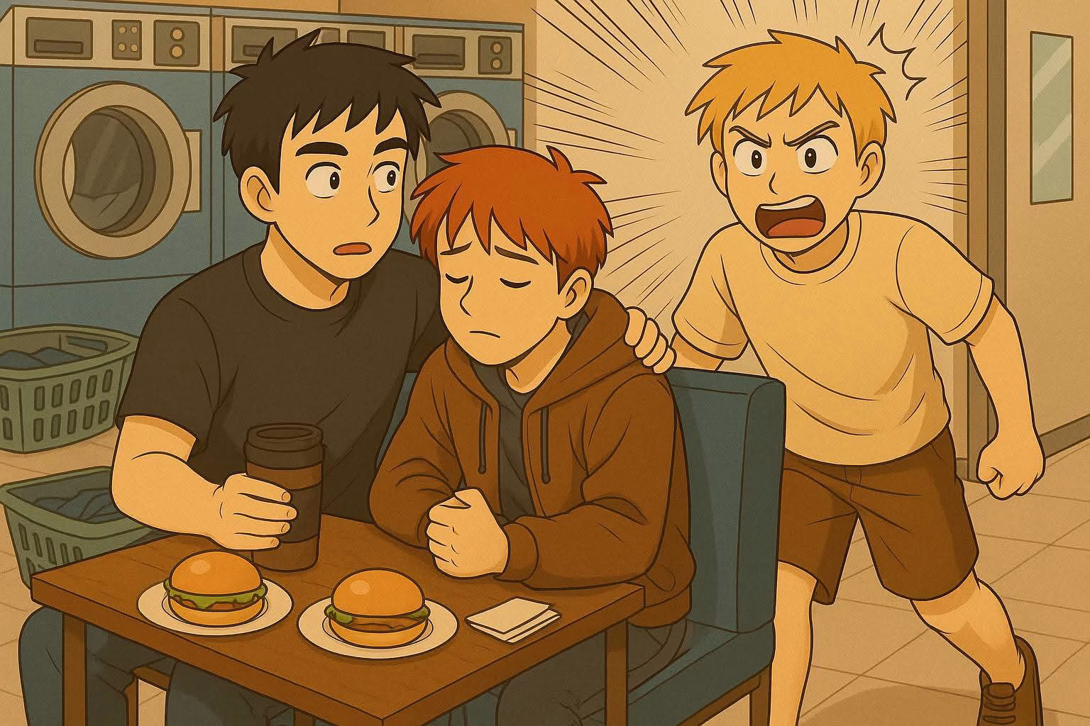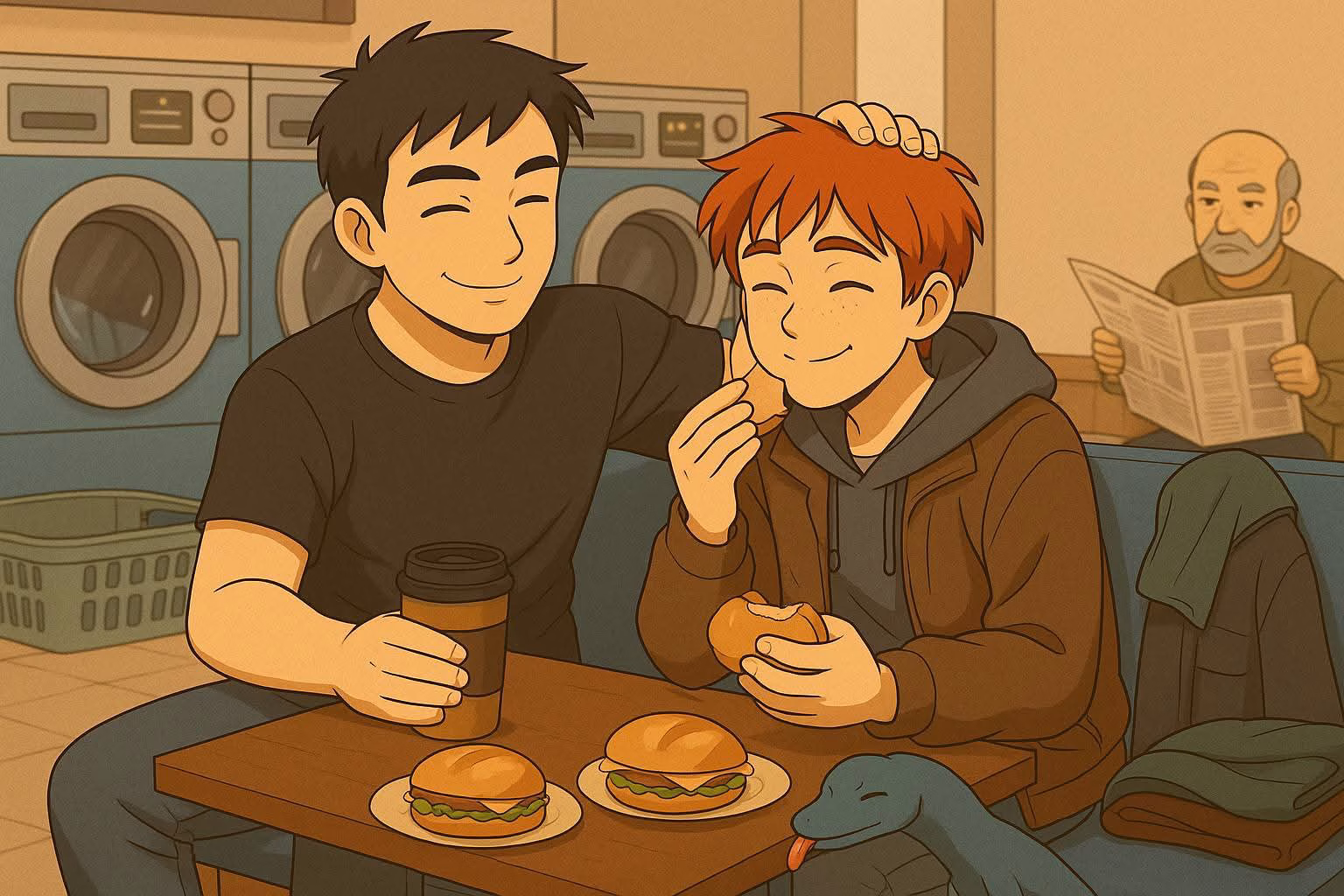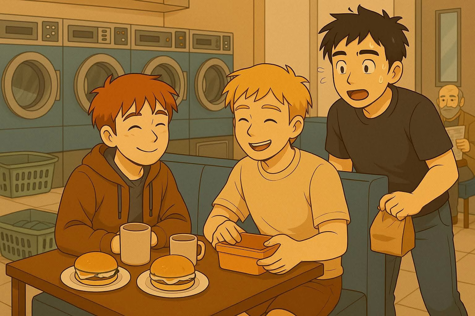 Philipp fühlte sich furchtbar. Er packte selbst ein Frühstück und ging zum Waschsalon. Tatsächlich – Paul saß da, ganz allein.