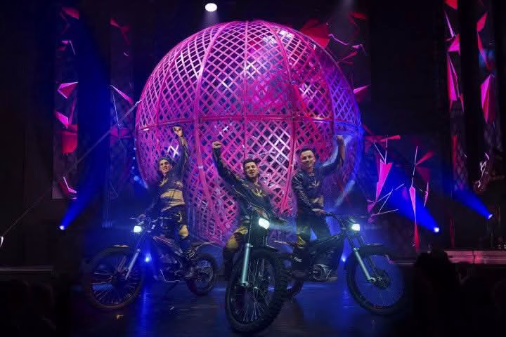 Besonders spektakulär: eine echte Weltneuheit – die kleinste Motorradkugel der Welt, in der drei vollelektrische Motorräder mit irrwitziger Präzision ihre Runden drehen. Diese waghalsige Nummer ist nicht nur technisch ein Meisterwerk, sondern sorgt beim Publikum regelmäßig für offene Münder.